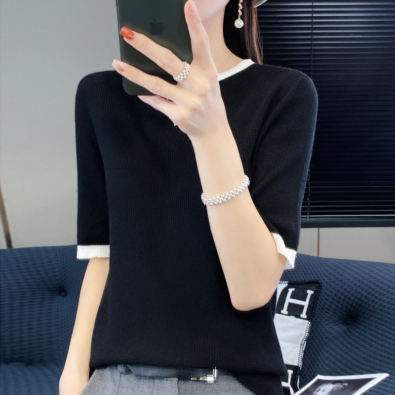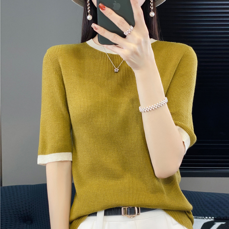 2024 New Fine Wool Knitted Sweater for Women, Color-Block Round Neck Pullover, Loose Casual Small Twist Pattern Half Sleeve Base Layer