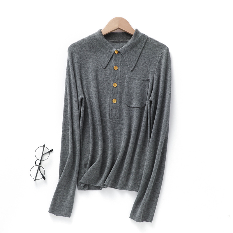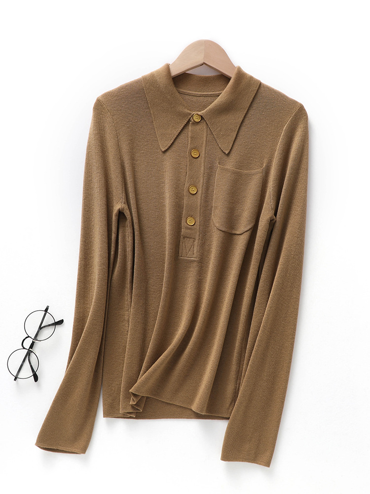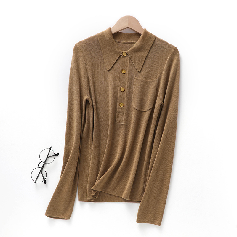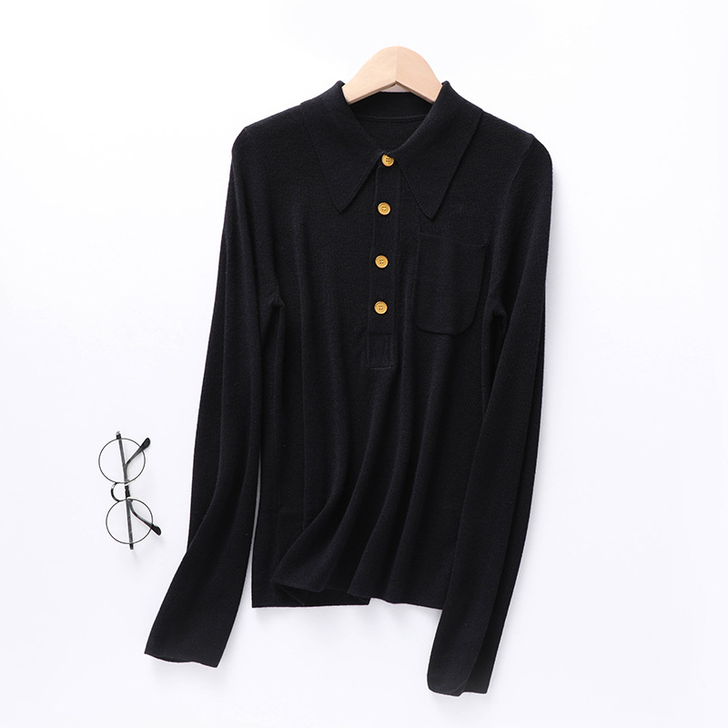 Knitted Shirt POLO Collar Korean Style Buttoned Pocket Fine Wool Solid Color Base Long Sleeve Women's Elegant Pullover