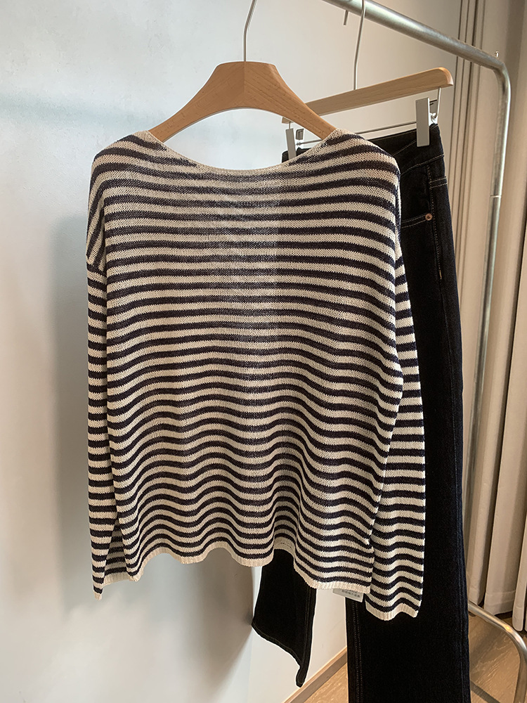 Japanese Washi Paper Yarn ~ Beautiful, Refreshing, and Relaxed Feel Lazy Off-Shoulder Long Sleeve Striped Base Shirt Cover-Up
